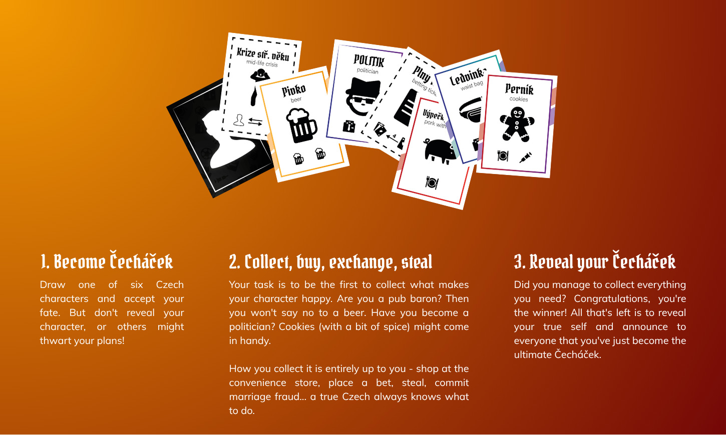 Want to spice up your evening at the pub with a light and quick game? Liven up your game night with something new and original? Or simply just want to have fun? Then Čecháčci is the clear choice for you!