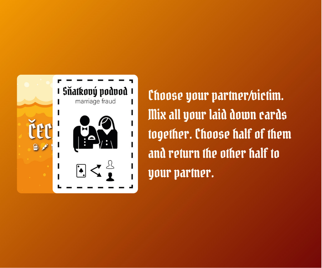 Apart from collectible cards, you can also influence the game with action cards. Each action card has a unique effect that can turn the tide of the game (typically by harming someone else—after all, mischief is one of the defining characteristics of Czechs). One such card is Marriage Scam: