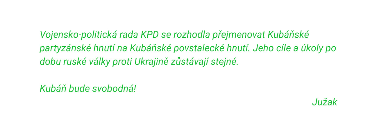 O Kubáňském partyzánském hnutí píšeme často. Tato skupina se srdcem i kořeny blízkými Ukrajině operuje na jihu Ruska - odtud možná i volací znak jejího zakladatele Južaka - a je považována za jednu z nejefektivnějších partyzánských skupin. Likviduje putinovskou válečnou logistiku, infrastrukturu i vojáky. Nedávno oznámila změnu názvu.