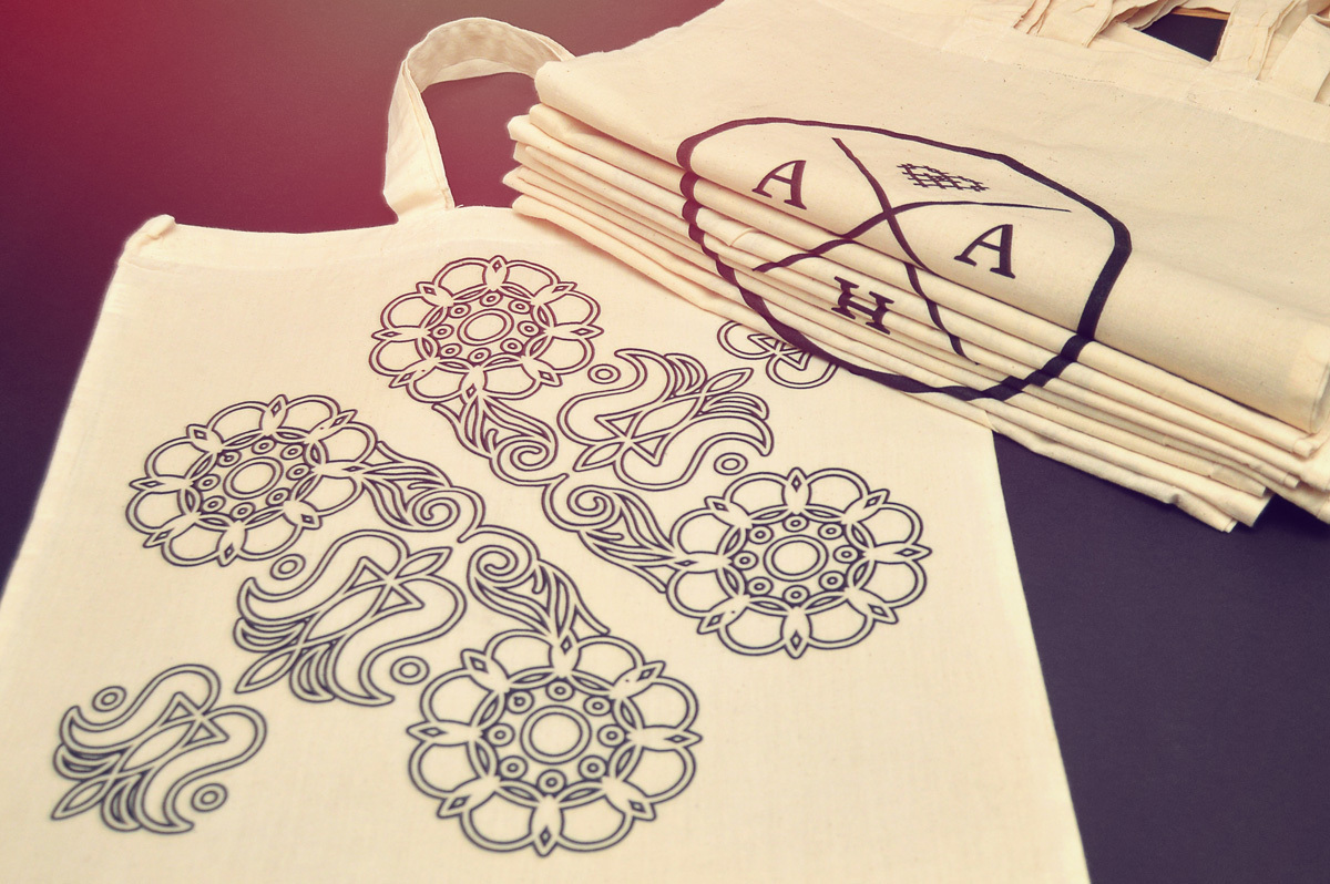 aha, balíčky s knihou AHA vám zabalíme do tejto super tašky. Z jednej strany logo projektu a z tej druhej grafika inšpirovaná slovenskou výšivkou.