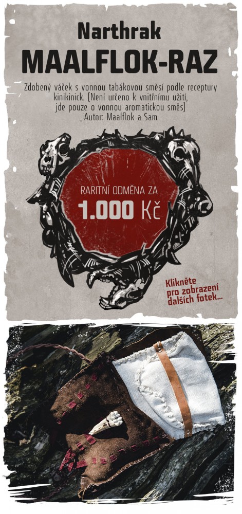 Raritní odměna: Zdobený váček s vonnou tabákovou směsí podle receptury kinikinick. (Není určeno k vnějšímu užití, jde pouze o aromatickou vonnou směs) [URL="http://www.jedenkmen.cz/gallery/jk_maalflok/"]Náhledová galerie[/URL]