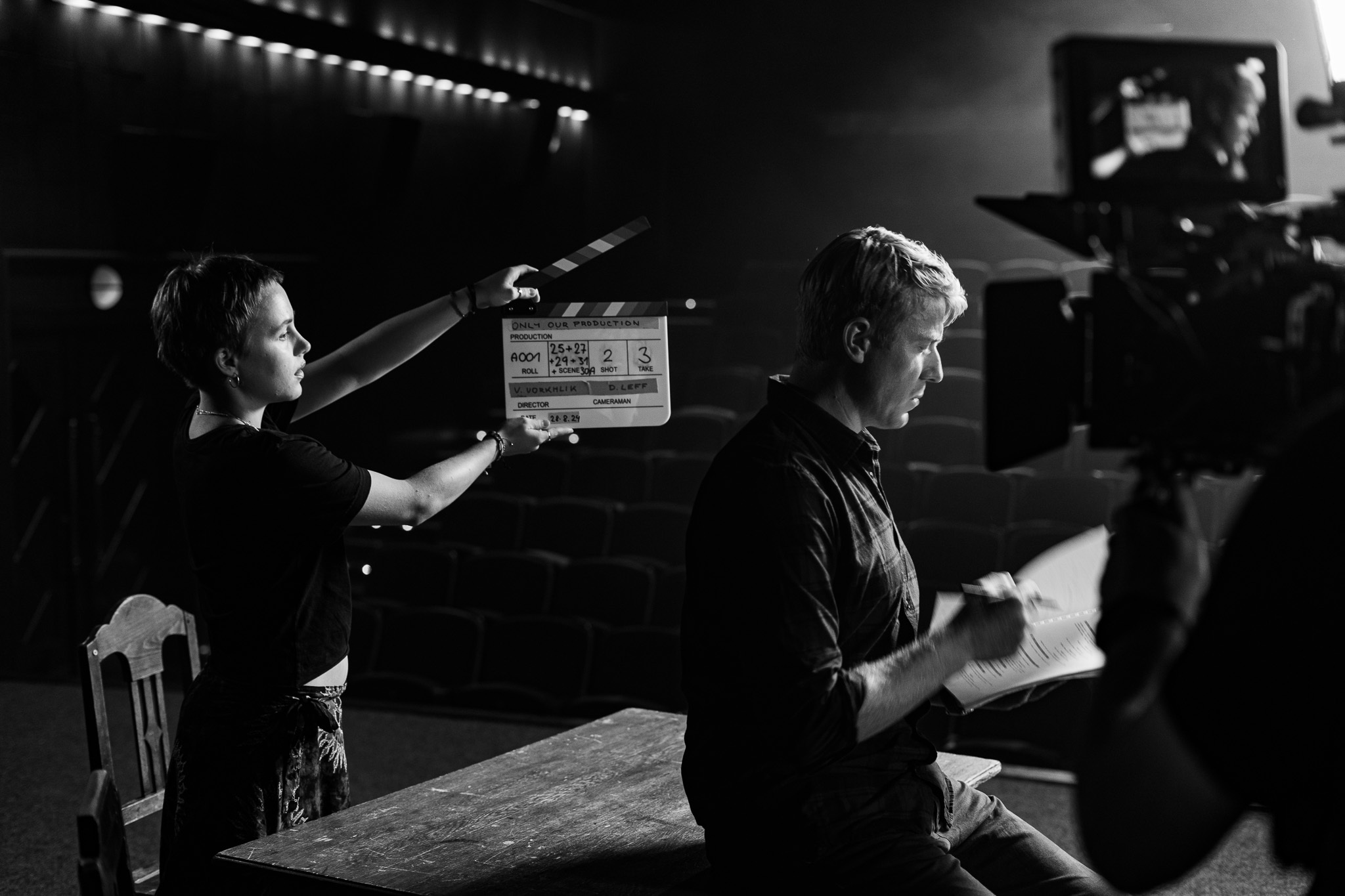Profesionální fotografie z natáčení filmu Divadelní nit podepsaná Radkem Melšou