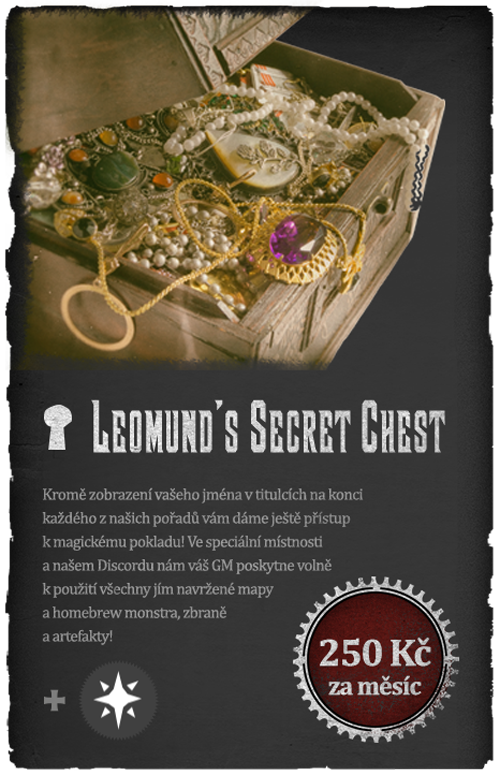 Kromě zobrazení vašeho jména v titulcích na konci každého z našich pořadů vám dáme ještě přístup k magickému pokladu! Ve speciální místnoti na našem Discordu vám náš GM poskytne volně k použití všechny jím navržené mapy a homebrew monstra, zbraně a artefakty!