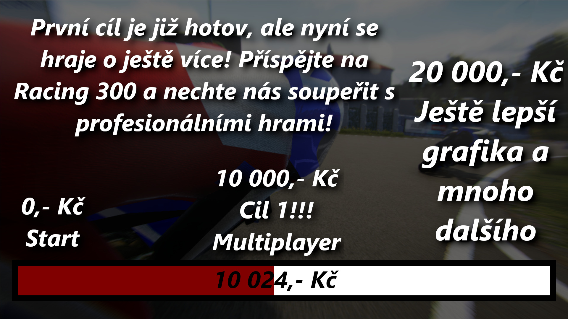 Dva roky žiju tvorbou hry Racing 300, na začátku jen málo lidí věřilo, že hra bude vůbec v nějaké podobě kdy dodělána. O dva roky později připravuji již 6. verzi hry, která za tu dobu nasbírala již přes 16 000 stažení! Předělání se nevyhne v nové verzi vůbec nic, bude rozšířena o nové okruhy z celé Evropy, nové herní módy a herní příběh. Do hry chci ale přidat ještě jednu velkou novinku a to MULTIPLAYER! Na rozdíl od ostatního bude stát MULTIPLAYER docela dost peněz a proto jsem na Startovači!