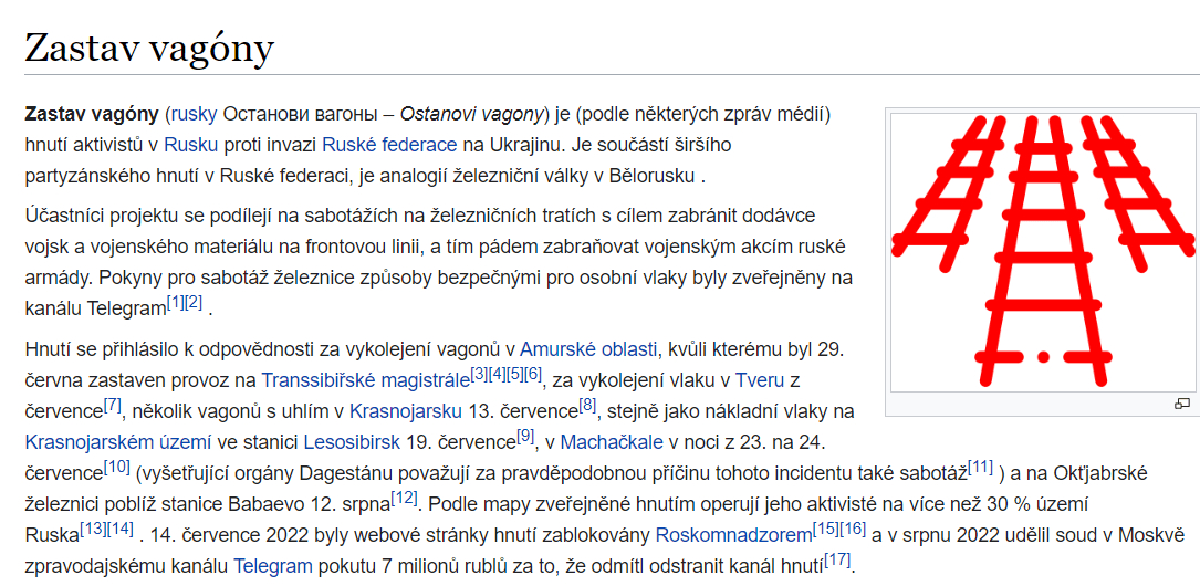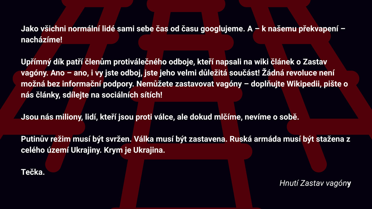 Protože máme štěstí a kamarádíme se s wikipedistou, získala skupina Zastav vagóny stránku i na české Wikipedii. A je to moc dobře, protože ta skupina už není. Zmizela. Když nějaký partyzánský kanál přestane postovat, znamená to většinou práci FSB. Nebýt informační podpory, jak to oni sami napsali, zavřela by se nad nimi voda úplně. Takhle aspoň víme, že existovali.