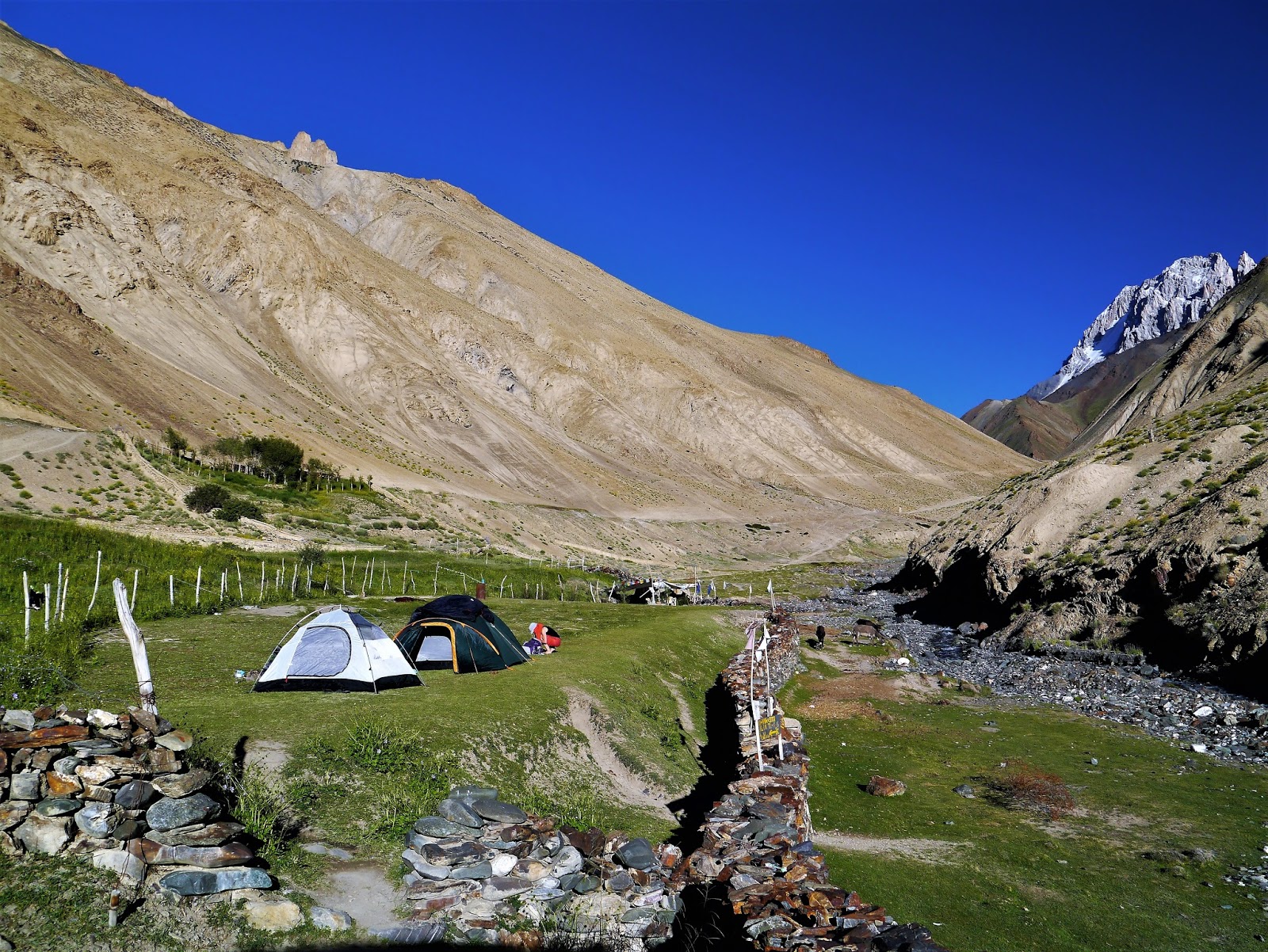 Noc je nakonec kupodivu klidná a jediné co mě trápí, je nateklá sliznice v nose, a tak spím s hubou dokořán. Několikrát mě tak budí strašné sucho v puse. Nikdy jsem neslyšela, že by nadmořská výška způsobila totální ucpání nosu i bez rýmy, ale vzhledem k tomu, že si na stejnou věc ráno stěžují všichni, je to asi normální. Jen David si stěžuje snad úplně na všechno. Prý skoro celou noc nespal, bolí ho hlava a chce se mu zvracet. Trochu mě to zneklidňuje. Sama jsem na to, že je teprve ráno, dost unavená. Po sbalení všech věcí klesáme korytem vyschlé řeky do vesničky Sumdah (3 900 m n. m.), kde si dáváme instantí polévku. Celou cestu jsme snili o pořádném jídle, ale jsme přece jen vysoko v horách, a tak nás tu žádná restaurace nečeká. Jen stinný dvorek vlídné místní rodiny, kde nám horkou vodou zalijí nudlovou polévku. Chjo, kdyby alespoň nebyla instantní.