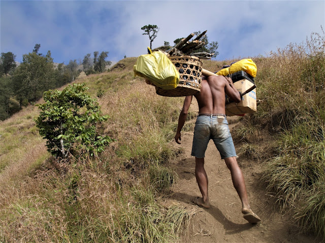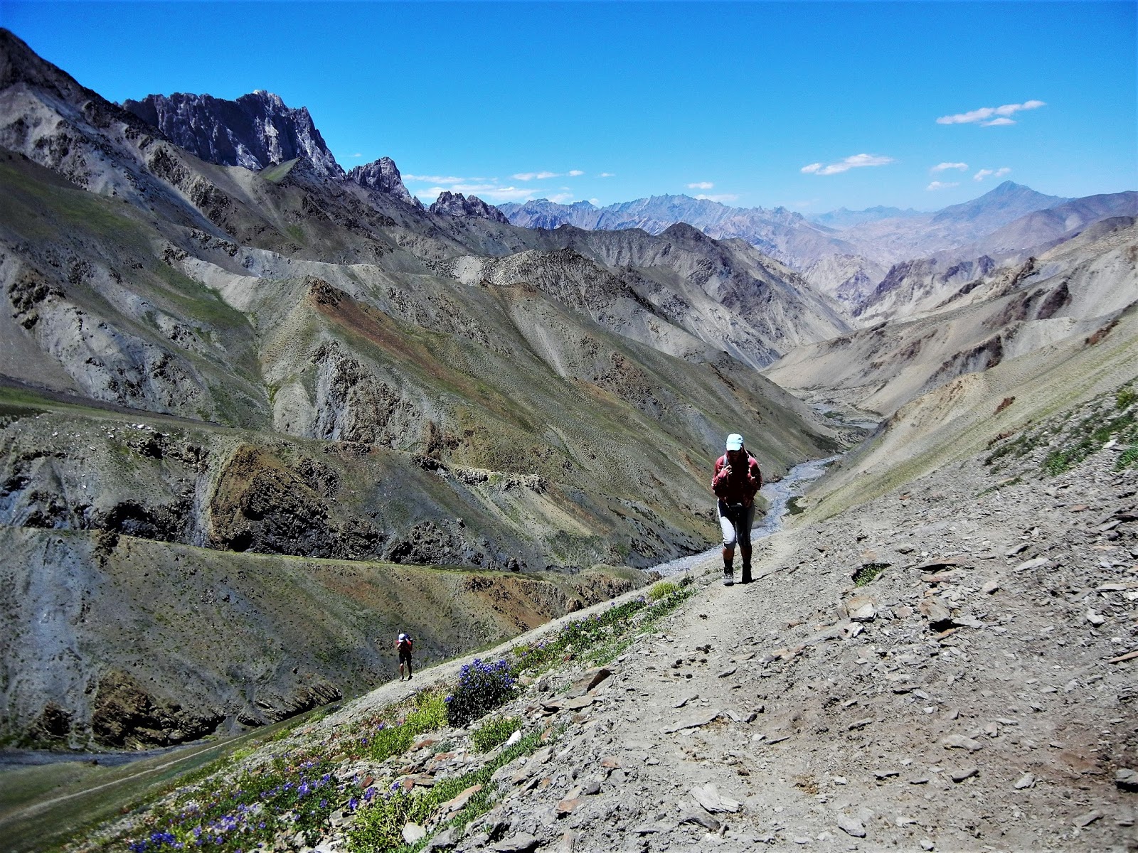 O popis výhledu do kraje se snad nebudu ani pokoušet. Je to něco neuvěřitelného. Připadám si jako mrňavý mraveneček v nekonečném moři hor. Až tady si člověk uvědomí, jak jsme my lidi, proti kolosu celé planety, strašně nicotný. Po chvíli strávené v sedle mě začíná opět bolet hlava. Beru si brufen a začínáme pomalu sestupovat dolů. Cesta je náročná, ale nádherná. Překvapuje mě, že v téhle nadmořský výšce kvetou krásně zvonky a ještě nějaké další barevné kytky, které neznám. Další věc, kterou bych tu nečekala jsou holuby. Ale je to zřejmě tvor přizpůsobivý, a tak snese ledacos, i větší nadmořskou výšku. Cachtají se snad v každém potůčku, který potkáváme, což mi opět přesvědčuje, že čistit vodu, je víc než rozumné. Po asi třech hodinách cesty narážíme na našeho pony mena s osli, který nám znovu utekl (dneska ale nebylo, naštěstí, kam odbočit). Batohy jsou už složené na zemi a oslíci se pokojně pasou. Jakoby zapomněli, co se dneska ráno přihodilo. Těžko říct, jestli mají vzácný dar tragédie rychle zapomínat a nebo budou své zemřelé mládě ještě dlouho oplakávat, stejně jako my lidé. Jen to není z jejich výrazu poznat.