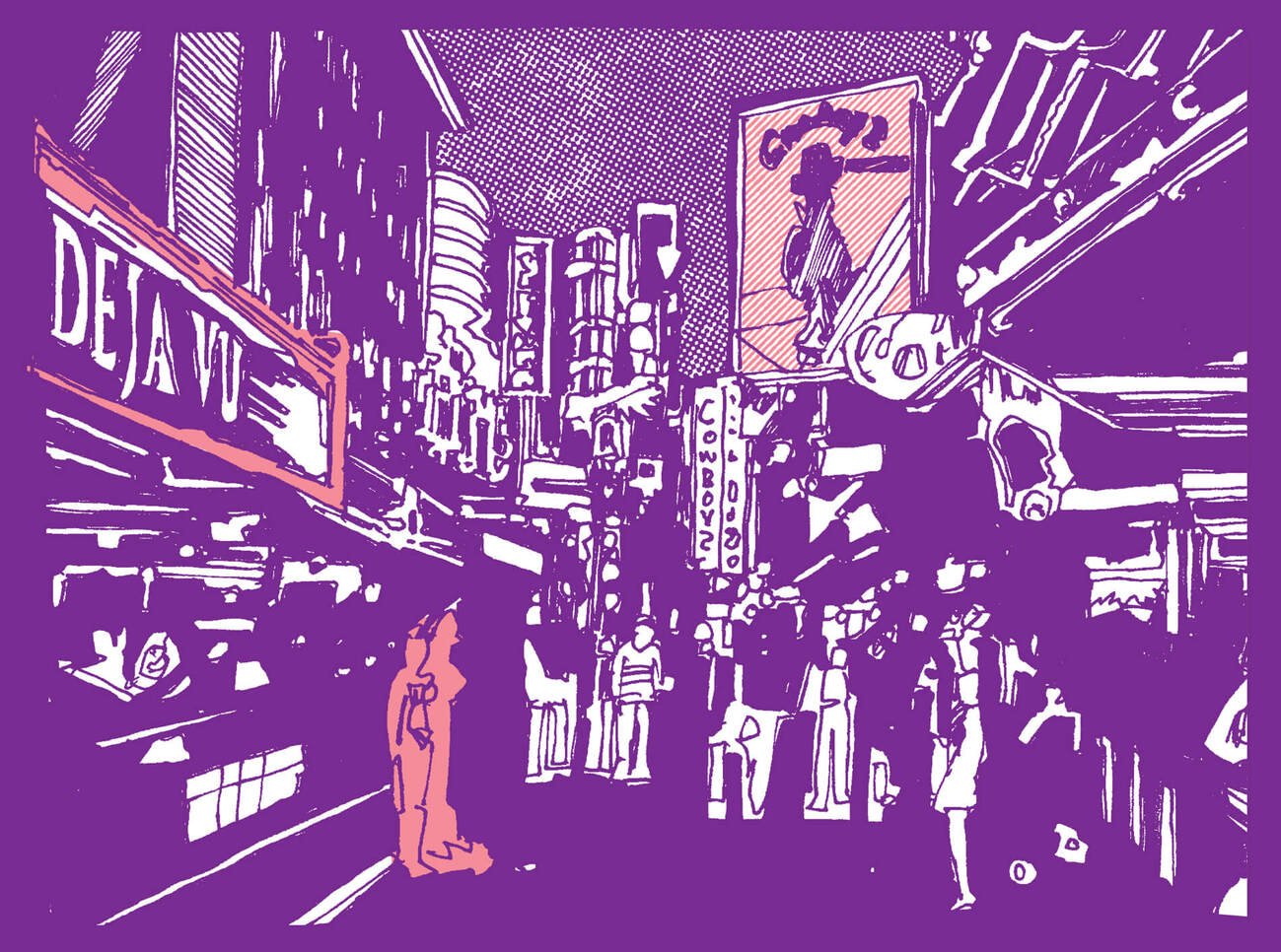 Šli jsme pryč. Sofie se tam zakecala s partou starších ženskejch z Kanady, co byly zrovna na tahu. No a my jsme šli s Lukášem do dvoupatrovýho stripu s červenejma oknama, abychom si ověřili tip, kterej jsme dostali od nějakejch boys před klubem. Lukáš byl dobrej sparing parťák do hampejzů.