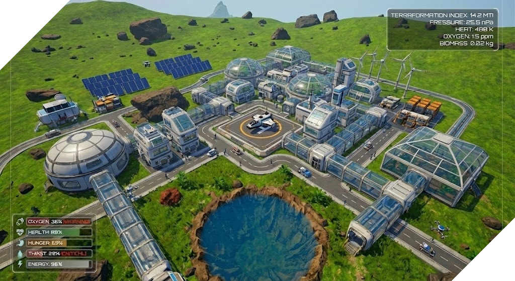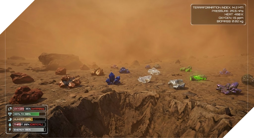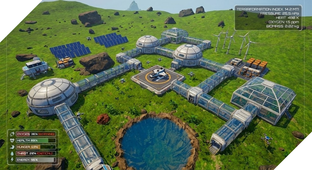 Skutečná teraformace: Vaše činy mění planetu. Zvyšujete teplotu, tlak, hladinu kyslíku . Sledujete, jak ledy tají, vznikají řeky a na vyprahlé půdě se objevuje první tráva. Počasí se dynamicky mění – od písečných bouří až po první déšť, který přijde až s vytvořením atmosféry.