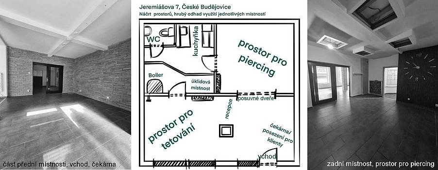 Pro naši práci jsme objevili naprosto perfektní prostory v srdci Českých Budějovic! Kousek od Hlavního nádraží a frekventované Lannovy třídy, v ulici Jeremiášova se uvolnil nádherný prostor o výměře 85m², který by se na Ateliér Gaia perfektně hodil a je téměř připraven pro zařizování! Nabízí dostatečně velkou pracovní plochu se spoustou světla, i komfortní čekárnu a zázemí pro klienty i personál. Studio čekají ještě nějaké kosmetické úpravy, zařízení a schválení příslušným orgánem a můžeme na to!