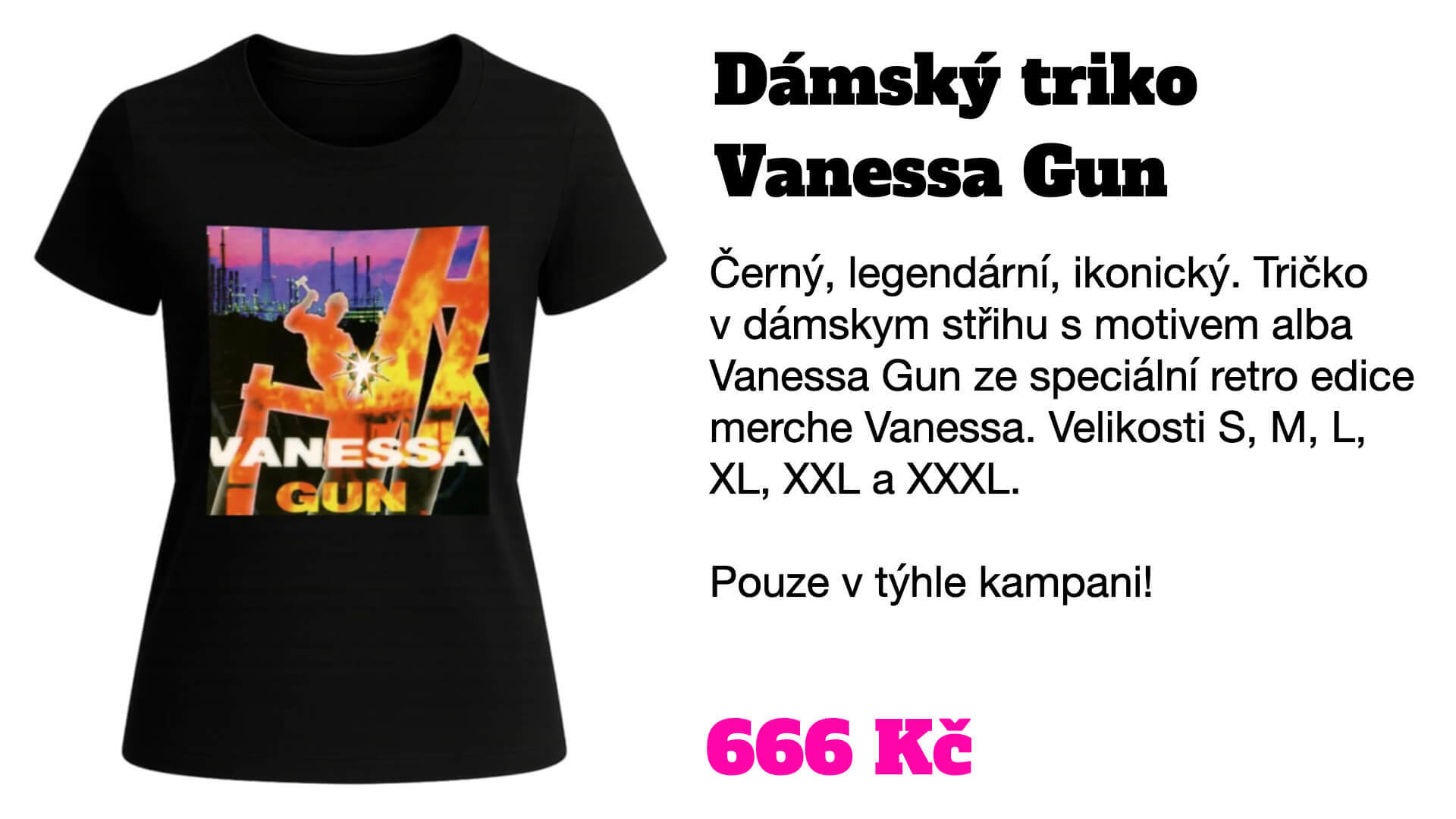 Černý, legendární, ikonický. Tričko v dámskym střihu s motivem alba Vanessa Gun ze speciální retro edice merche Vanessa. Velikosti S, M, L, XL, XXL a XXXL (uveď do poznámky jakou chceš velikost). Pouze v týhle kampani!
