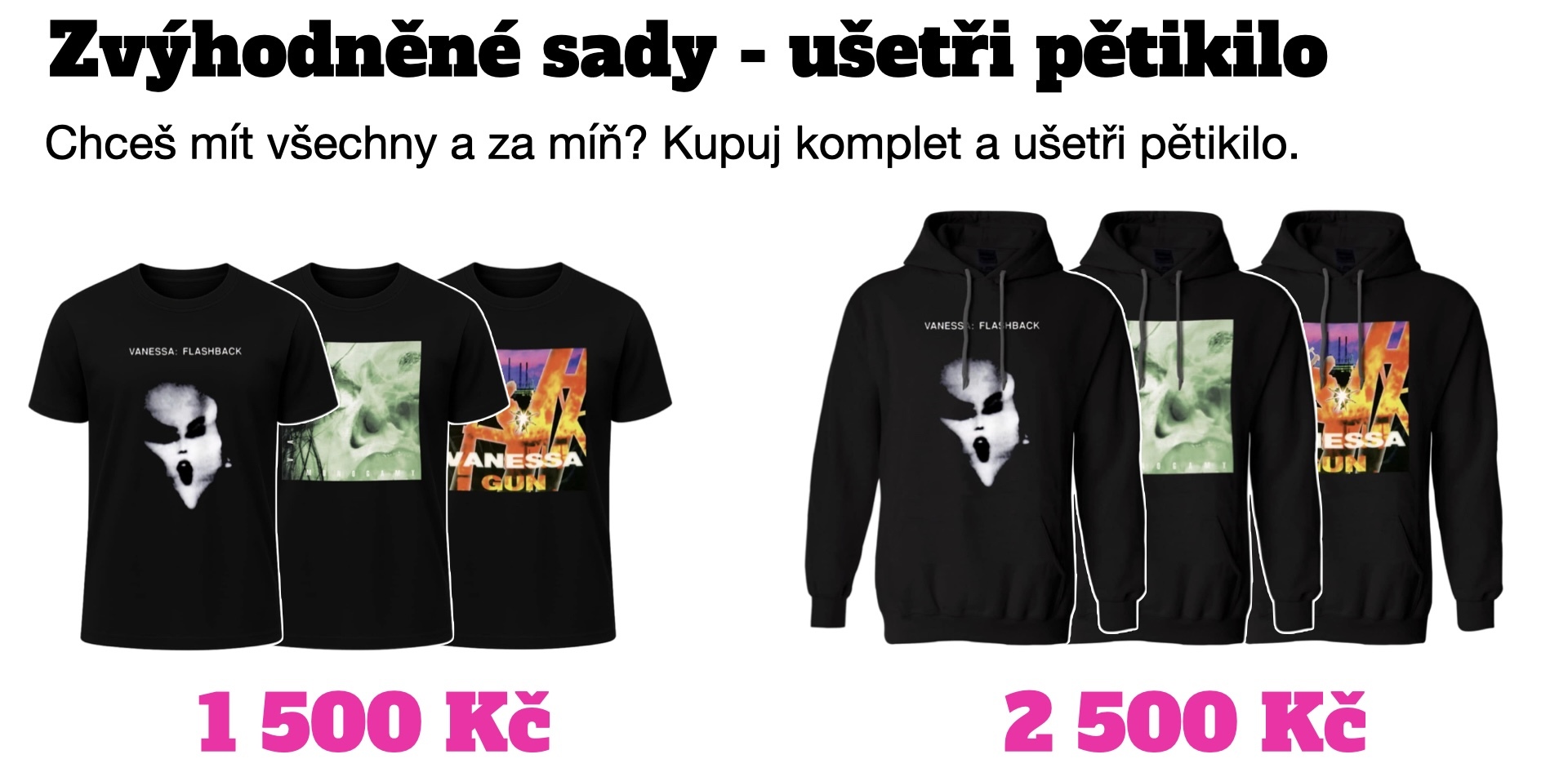 Chceš mít všechny a za míň? Kupuj komplet všech tří mikin s motivy tvejch oblíbenejch desek od Vanessy a ušetři pětikilo. Velikosti S, M, L, XL, XXL a XXXL (uveď do poznámky jakou chceš velikost).