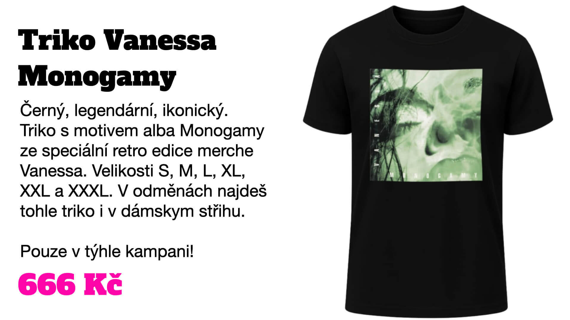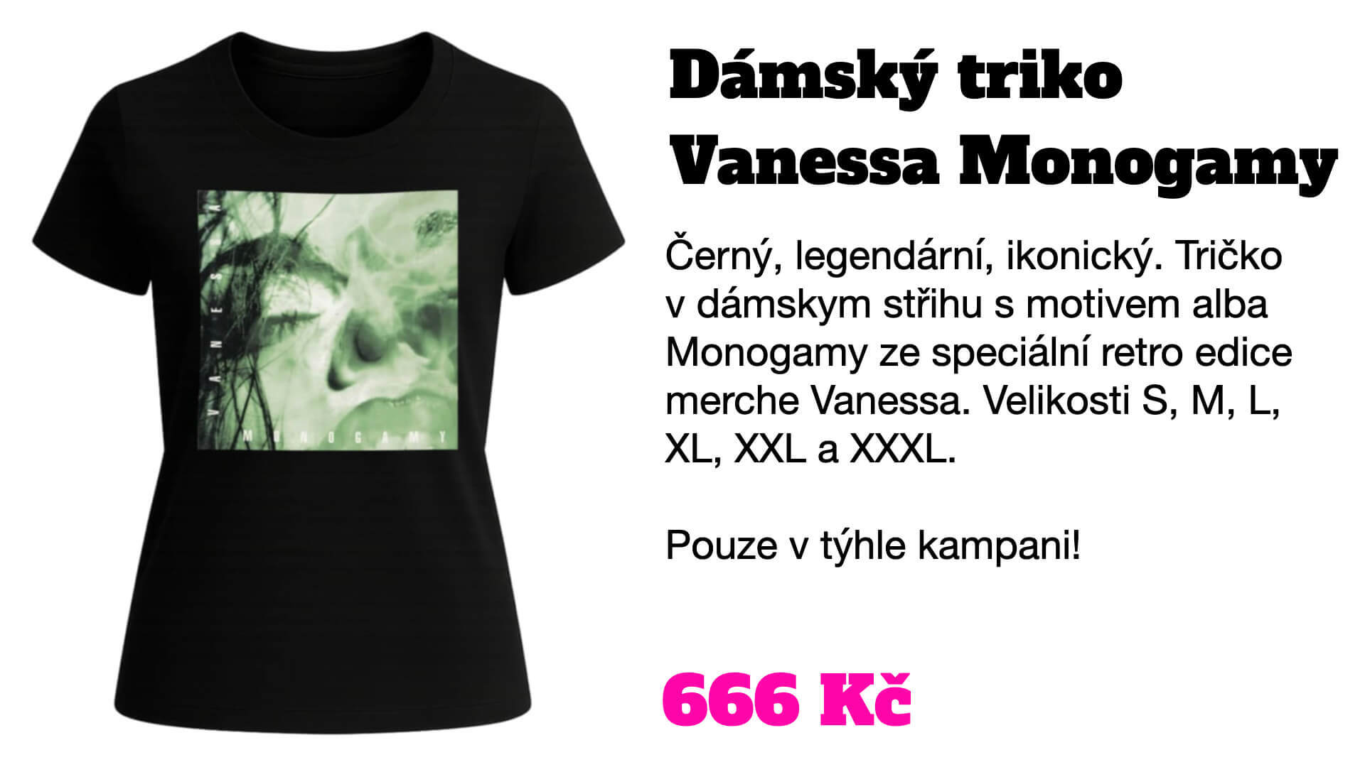 Černý, legendární, ikonický. Tričko v dámskym střihu s motivem alba Monogamy ze speciální retro edice merche Vanessa. Velikosti S, M, L, XL, XXL a XXXL (uveď do poznámky jakou chceš velikost). Pouze v týhle kampani!