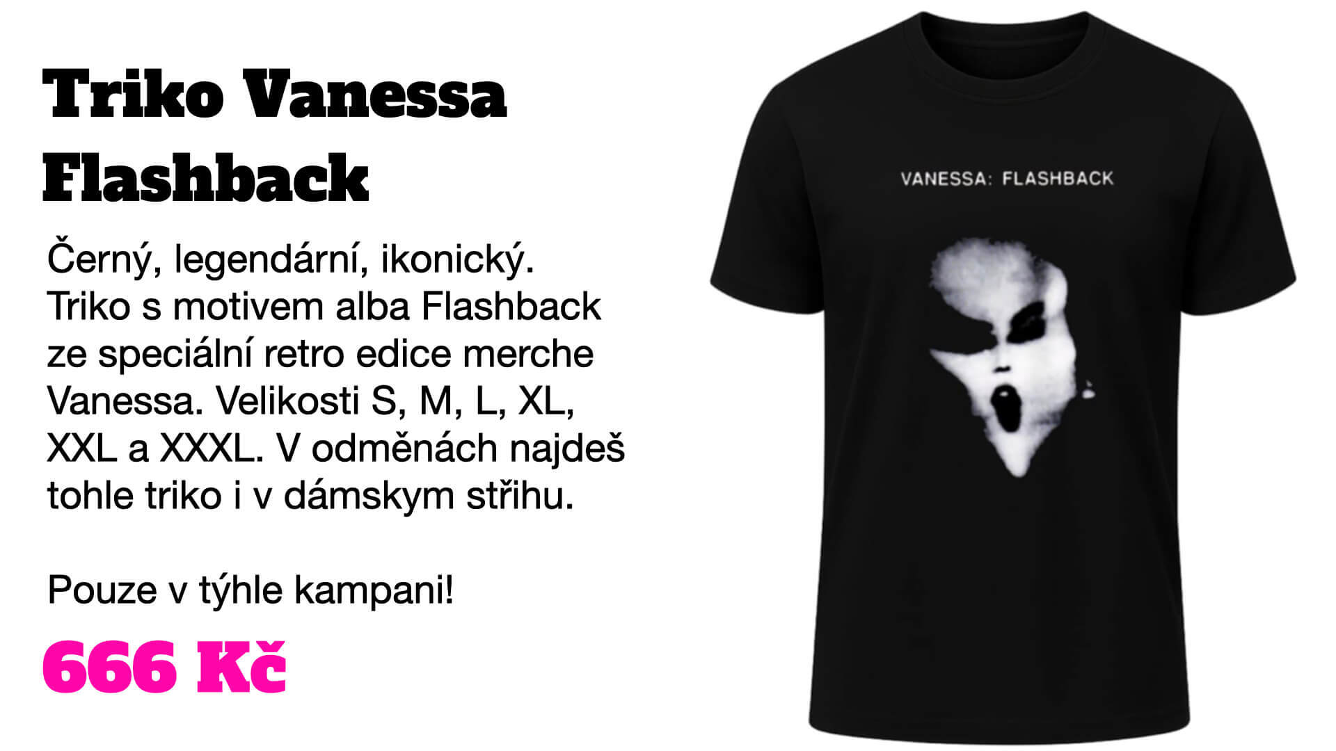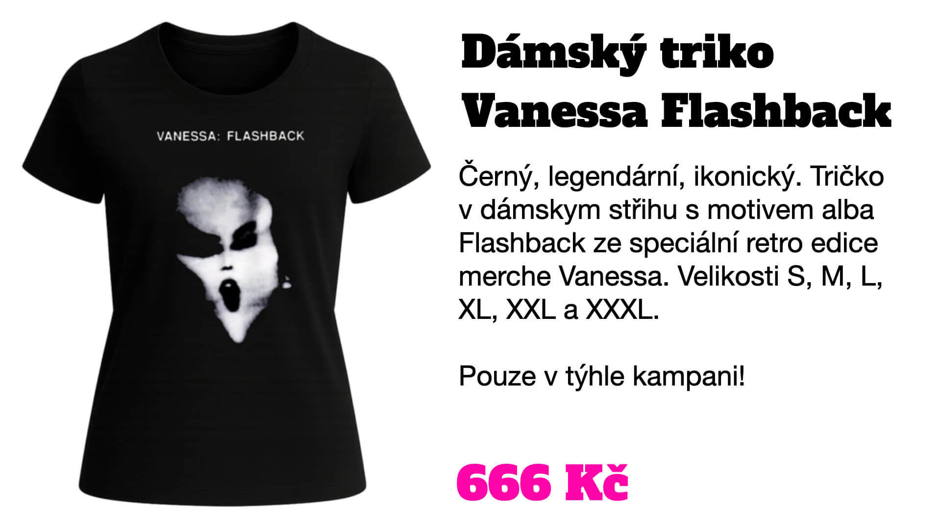 Černý, legendární, ikonický. Tričko v dámskym střihu s motivem alba Flashback ze speciální retro edice merche Vanessa. Velikosti S, M, L, XL, XXL a XXXL (uveď do poznámky jakou chceš velikost). Pouze v týhle kampani!
