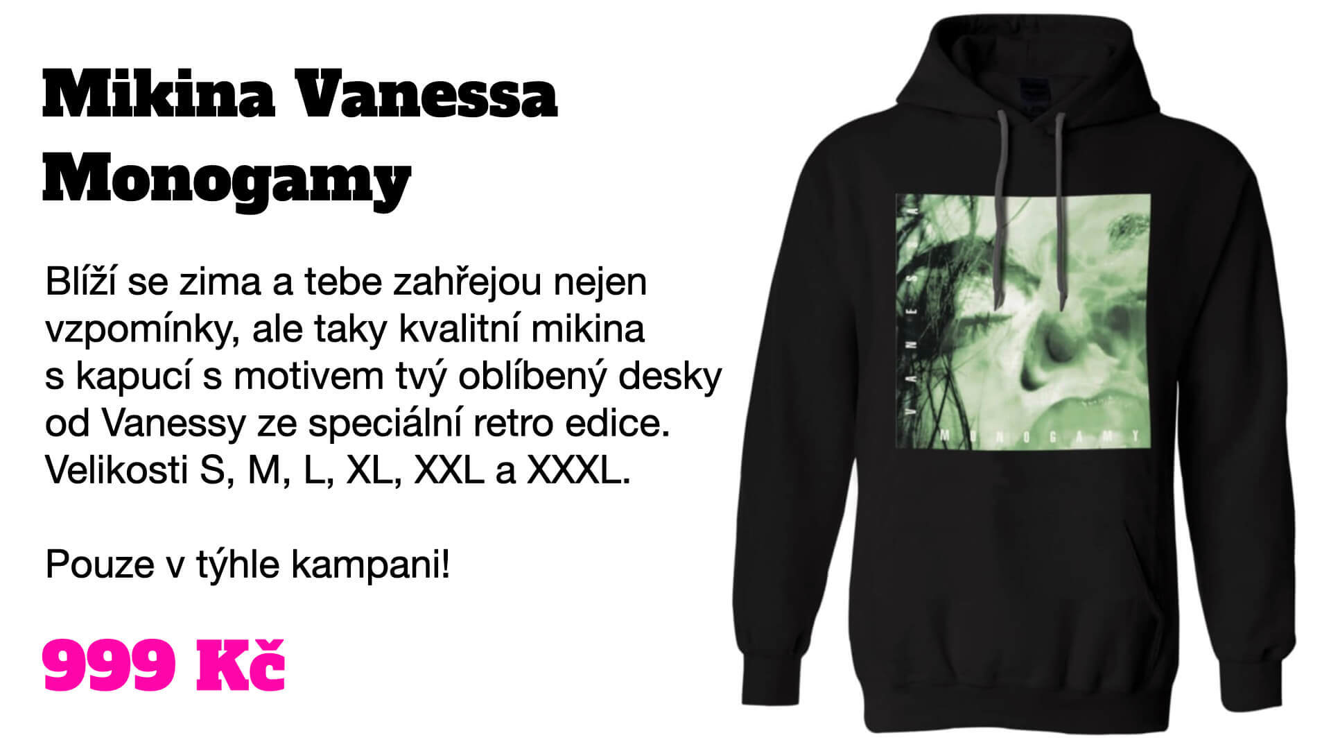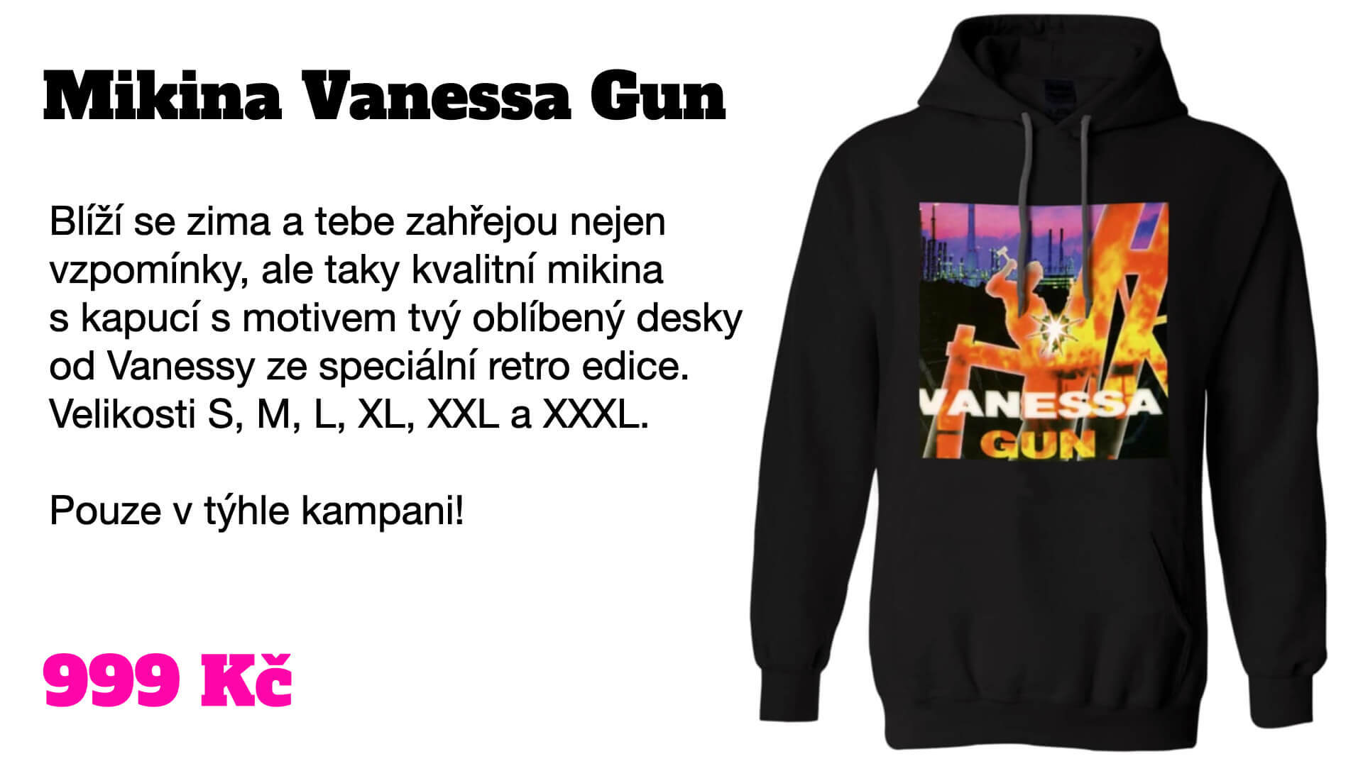 Blíží se zima a tebe zahřejou nejen vzpomínky, ale taky kvalitní mikina s kapucí s motivem tvý oblíbený desky od Vanessy ze speciální retro edice. Velikosti S, M, L, XL, XXL a XXXL (uveď do poznámky jakou chceš velikost). Pouze v týhle kampani!