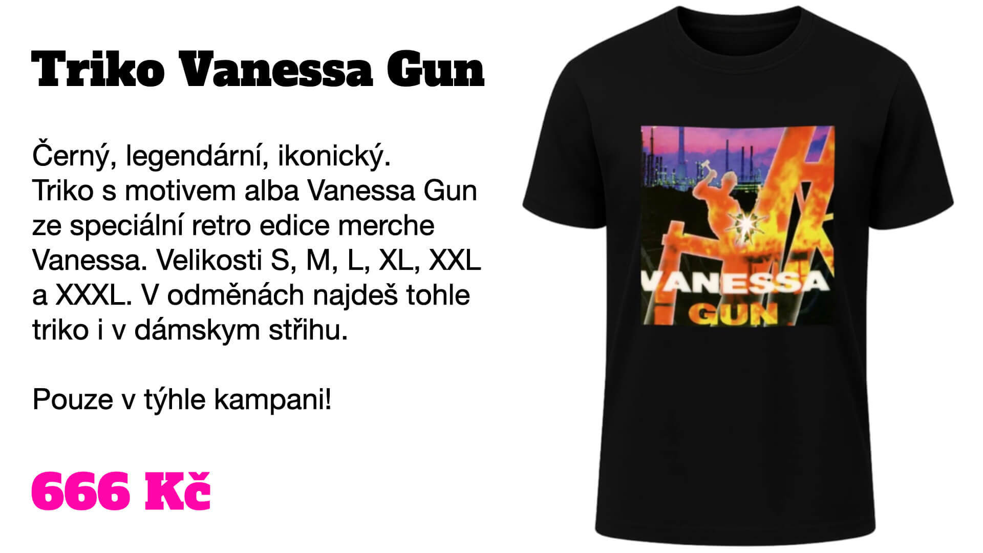 Černý, legendární, ikonický. Triko s motivem alba Vanessa Gun ze speciální retro edice merche Vanessa. Velikosti S, M, L, XL, XXL a XXXL (uveď do poznámky jakou chceš velikost). V odměnách najdeš tohle triko i v dámskym střihu. Pouze v týhle kampani!