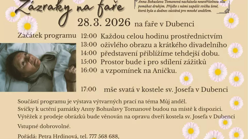 Akce se uskuteční 28.3.2026 na faře v Dubenci, kde se budou konat oživlé obrazy a představení k výročí úmrtí Anny Tomanové (29.3.1957) Program bude probíhat celé odpoledne spolu s doprovodným programem talentovaných dětí.